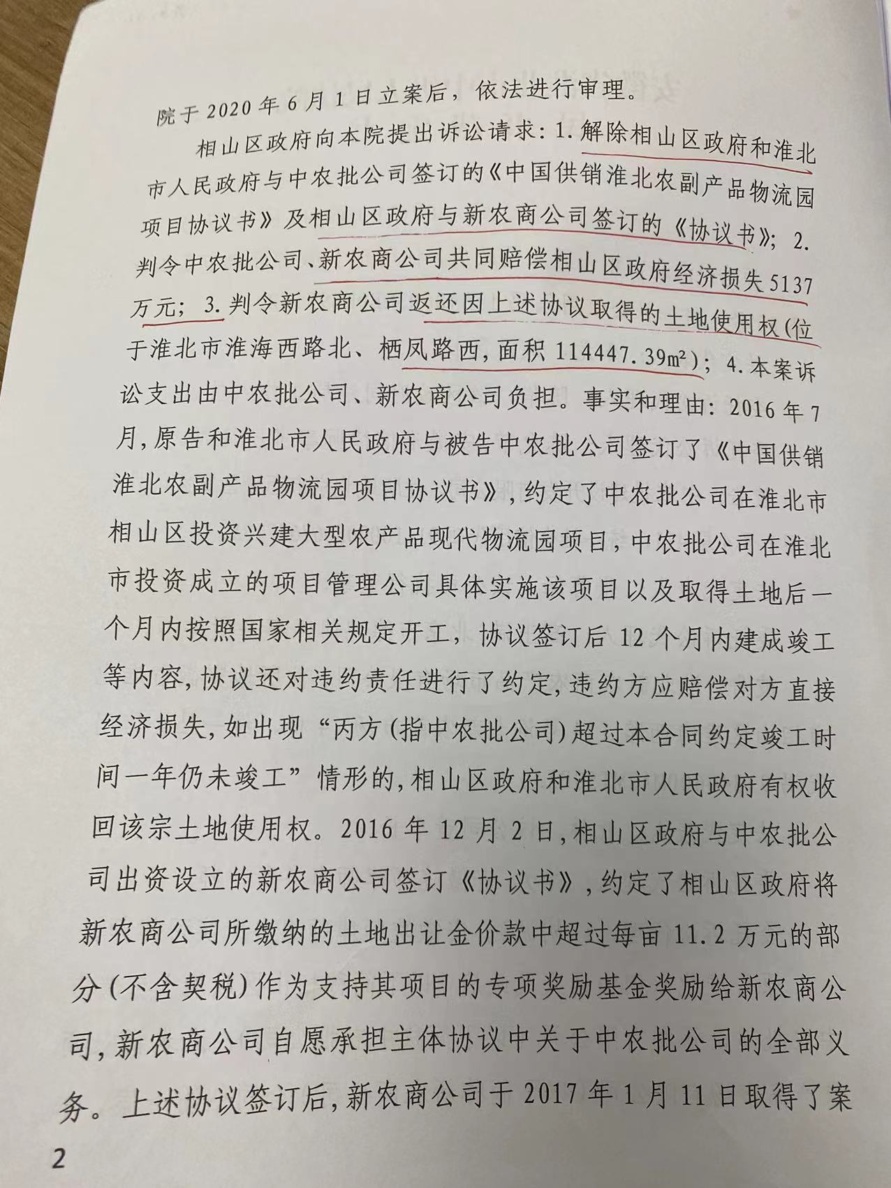 淮北市相山区人民政府与中农批建设开发有限公司、淮北新农商农产品市场有限公司合同纠纷2